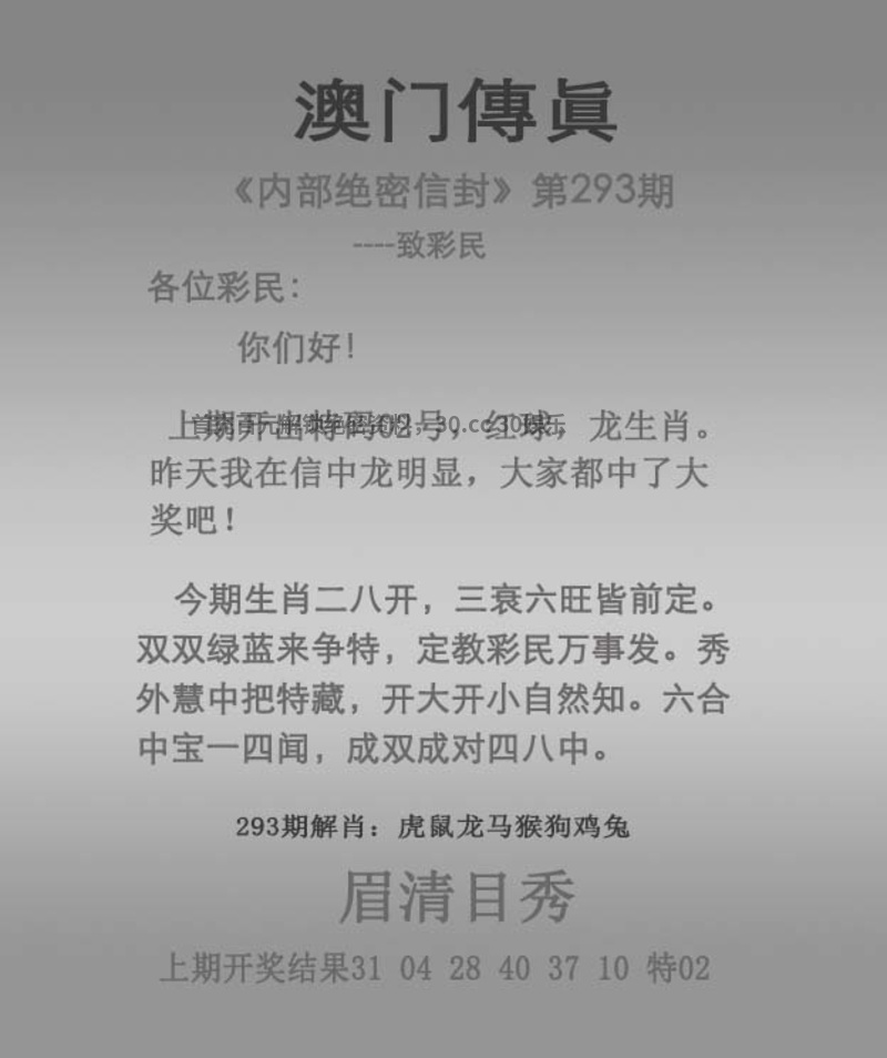 292期【马会传真】开龙02准 今期生肖三六开,一三四五相加数 小鸟一排在远方,画虎画皮难画骨 一克容情造乾坤,农夫家里出千金 看定灵码要下注,好雨滋润万木荣 解:今期生肖三六开,解三头特码30-39,画虎画皮难画骨,解凶丑生肖鼠牛虎猴狗猪 综合:蛇兔猪鼠龙马鸡牛虎 主特:25.27.07.06.02.12.33.17.04 |